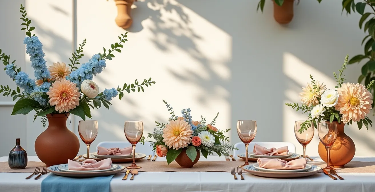 Como se puede ver en la imagen, inspirada en la arquitectura andaluza, la predominancia de tonos cálidos y neutros (la pared encalada, las macetas de terracota) crea un fondo sereno sobre el que los acentos azules pueden brillar con elegancia sin abrumar. Según expertos en diseño floral de bodas, la regla 60-30-10 es un concepto de decoración atemporal que permite crear esquemas de color equilibrados con facilidad. El color de acento, aunque solo representa el 10%, es el que a menudo une todo el aspecto visual.