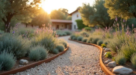 El contraste duro versus blando equilibra la composición: elementos arquitectónicos como piedras, acero corten o cerámica (duros) dialogan con flores etéreas y gramíneas ondeantes (blandos). Un jardín mediterráneo típico ejemplifica esto magistralmente: muros de piedra caliza contrastan con Lavanda, Romero y Santolina.