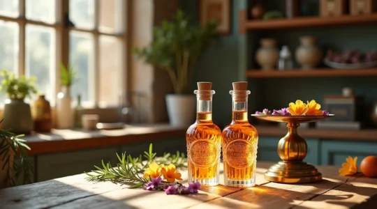 Las infusiones en frío de alcohol (maceración) son la base de licores y destilados botánicos caseros. Vodka o ginebra infusionados con pétalos de rosa, lavanda o flores de hibisco durante 3-7 días adquieren personalidad única. Para cócteles sin alcohol, los jarabes florales (1:1 de azúcar y agua infusionada con flores) aportan complejidad a limonadas, tés helados o mocktails. Un jarabe de violetas transforma una simple copa de cava en un aperitivo sofisticado.